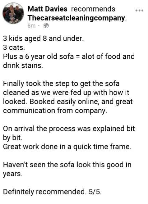 At The Car Seat Cleaning Company we're reaching for the stars with our top-notch service and our customers across the UK agree - we've got thousands of happy customers, with glowing reviews. We specialise in deep cleaning car seats, family sofas, armchairs and pouffes with a difference! See why our customers love us today.